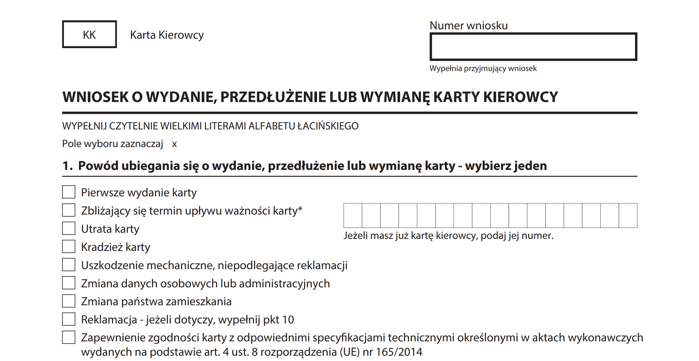 Kartę kierowcy można wyrobić przez Internet lub papierowo za pomocą poczty. Wniosek składa się poprzez stronę internetową: https://info-car.pl/new/tachograf/uzyskaj-karte-do-tachografu/kanal-wnioskowania?type=Karta%20kierowcy. Na tej stronie można także pobrać papierowy wniosek.