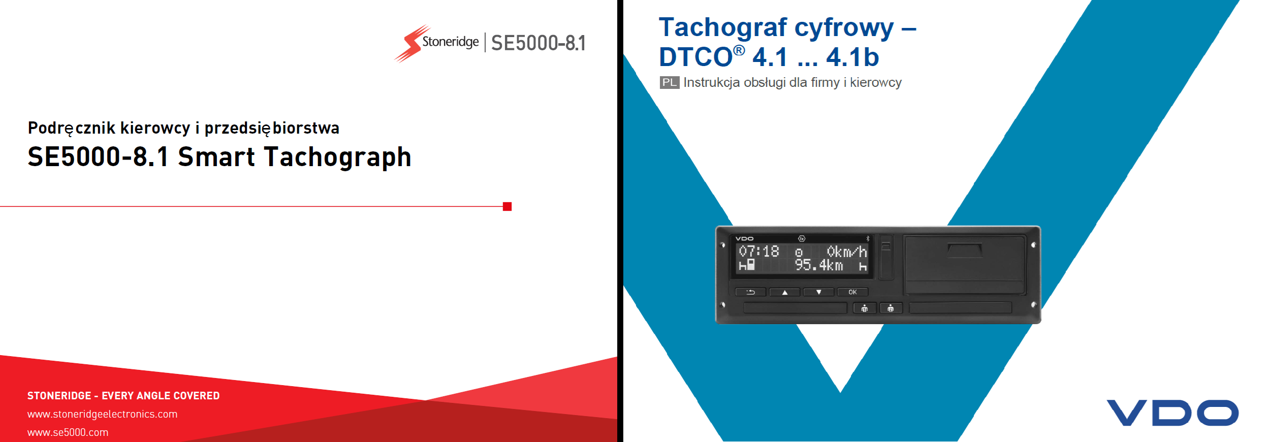 Udostępnione instrukcje obejmują obsługę najpopularniejszych tachografów inteligentnych drugiej generacji (G2V2), w tym VDO DTCO 4.1–4.1b oraz Stoneridge SE5000-8.1, które są obowiązkowe w transporcie międzynarodowym. Oba podręczniki zawierają część dla kierowcy i część dla przedsiębiorstwa. Opisują m.in. sposób wkładania i wyjmowania karty kierowcy, wykonywanie wpisów kraju, uzupełnianie wpisów manualnych, zmianę aktywności, znaczenie symboli i komunikatów na wyświetlaczu, wykonywanie wydruków oraz pobieranie danych z karty i pamięci tachografu.