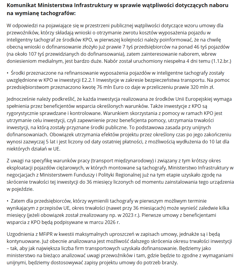 Przypomnijmy, że wnioski o refinansowanie wymiany tachografów można składać do końca stycznia 2026 roku, wszelkie niezbędne informacje w tym zakresie znajdą Państwo w poprzednich aktualnościach. Ostatnim krokiem po weryfikacji wniosku o refinansowanie tachografów będzie podpisanie umowy. Ministerstwo Infrastruktury na wniosek przewoźników pracuje już nad zmianą zapisów wspomnianej umowy, aby była lepiej dopasowana do realiów branży. Pojawił się specjalny komunikat w tej sprawie: